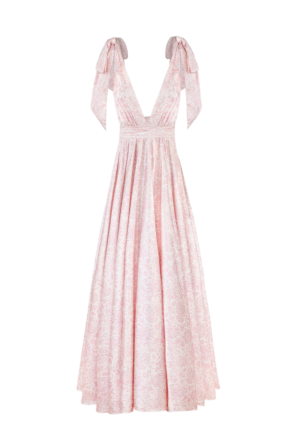 The Fiona maxi dress in soft pink silky bespoke Isphahan floral fabric  has a plunging V neckline that fastens with plush bowties ,and a flowing longline silhouette that falls to floor skimming hem. The Fiona maxi  dress is perfect glamorous events.